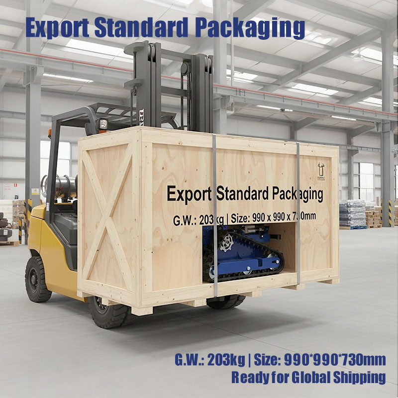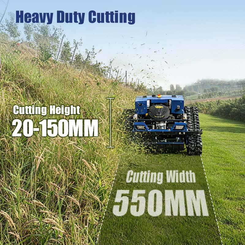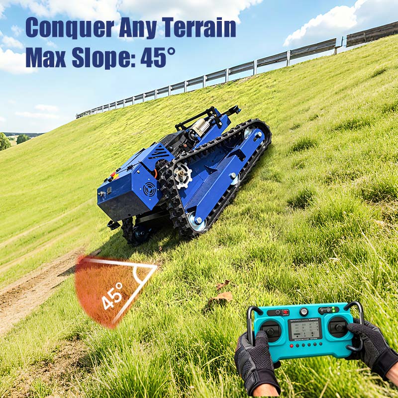 Stability is the soul of the VR-LM550SL. Unlike standard mowers that struggle on soft soil, our 150mm wide, 32-section tracked chassis distributes weight evenly, minimizing ground pressure. This allows the machine to operate safely on 40° slopes, riverbanks, and highway embankments where manual mowing is impossible. The low-profile, compact design (930870560mm) enables the mower to glide under low-hanging fruit tree branches or navigate tight urban greenbelts, making it an indispensable tool for orchards and solar farm vegetation control.