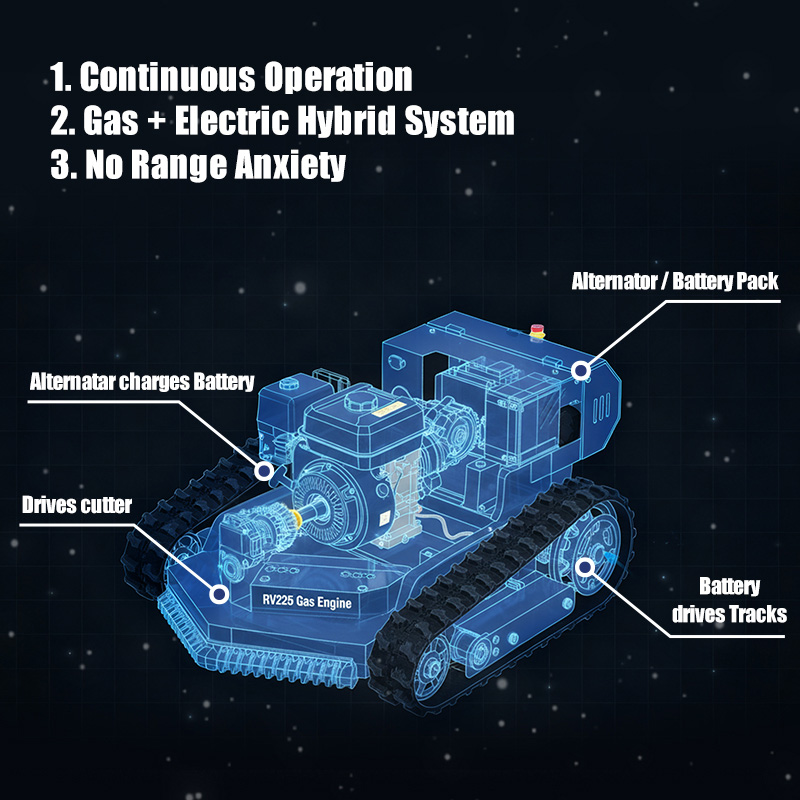 The VR-LM550SL redefines operational endurance by combining a Loncin LC1P75F gasoline engine with a smart electric walking system. The 4.5Kw four-stroke engine provides the raw torque required for the 500mm dual-blade cutting system, spinning at up to 3000 RPM for a clean, professional finish. Simultaneously, the onboard self-charging system replenishes the dual 12V/12Ah batteries while the engine is running. This hybrid architecture eliminates “battery anxiety” in remote locations, ensuring the brushless walking motors have constant power for long-duration outdoor projects.